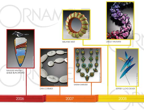 In the most recent issue of Ornament Magazine there is an article by Jill DeDominucis =” Polymer Clay a Modern Medium Comes of Age ” that features a timeline of artists that the magazine has featured in the past twenty four years.